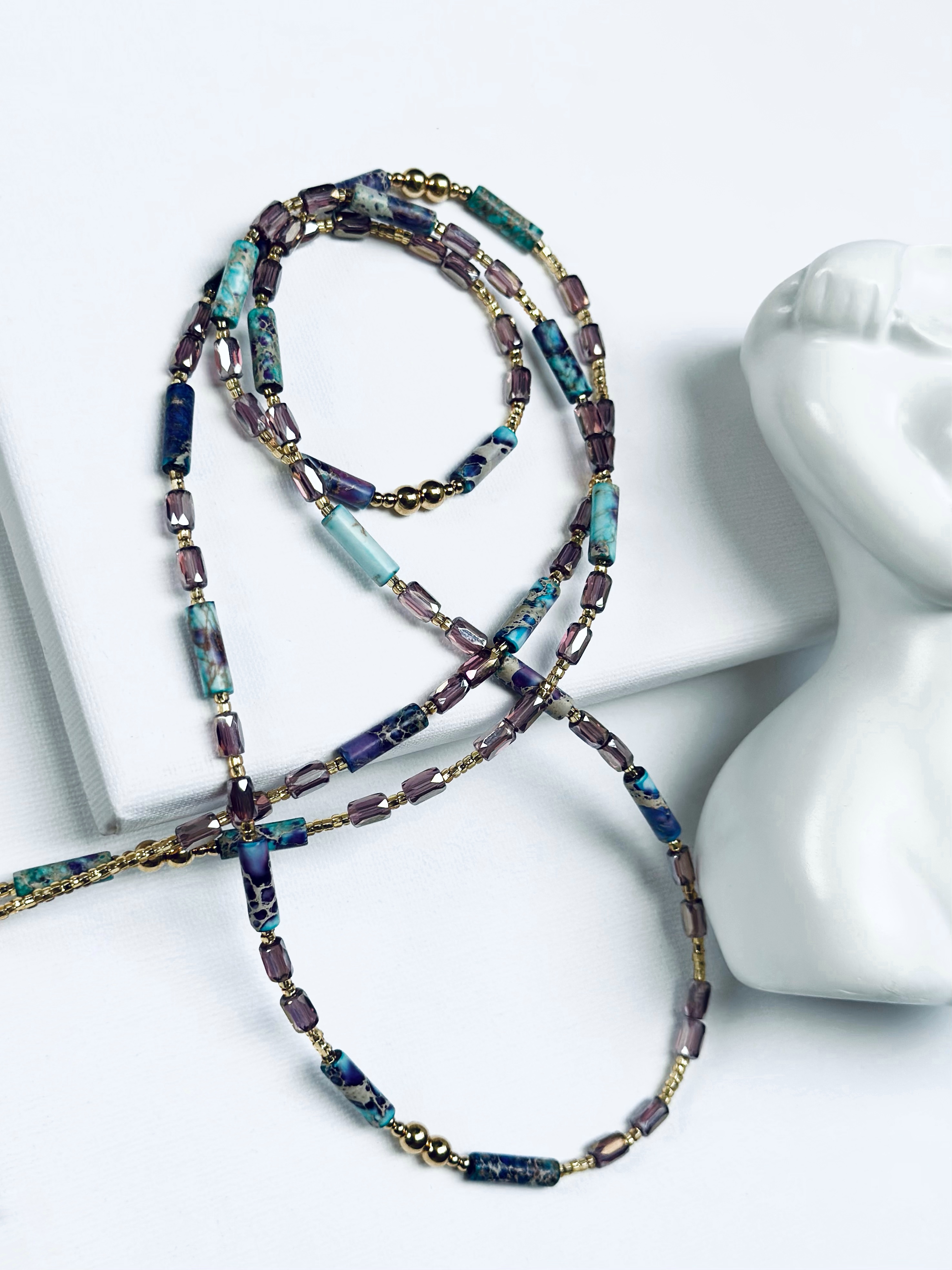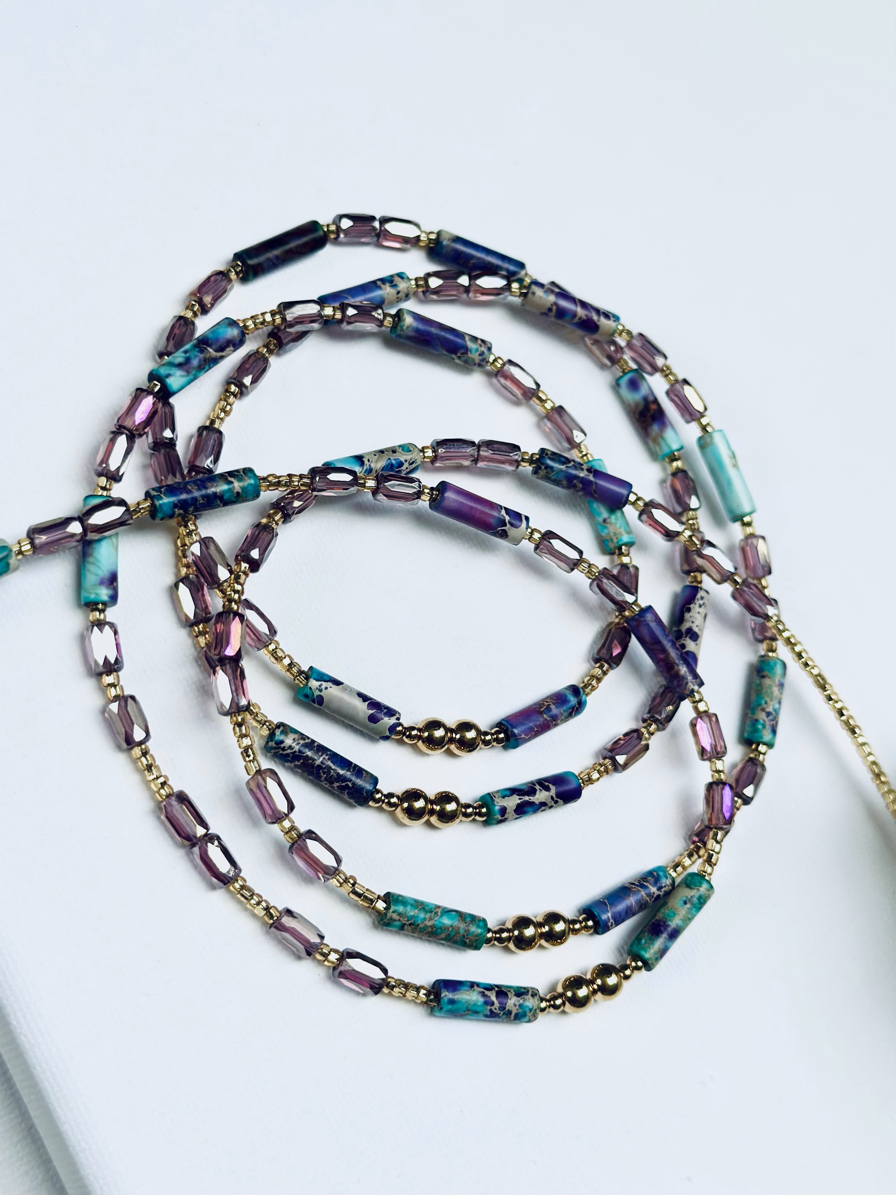 waist bead is a medium size, made with a purple cylinder shape glass bead, natural smooth cylinder shape 4mm in size and a gold color metal bead and a touch of gold color seed bead.  You need at least 3 strands. price is for a strand, and it goes round your waist just Onces. waist bead is made with a silicon string or fish line and comes with a stainless-steel hook clasp and a free extra 2 inches chain extension. will not draw in your cloth if worn properly.
